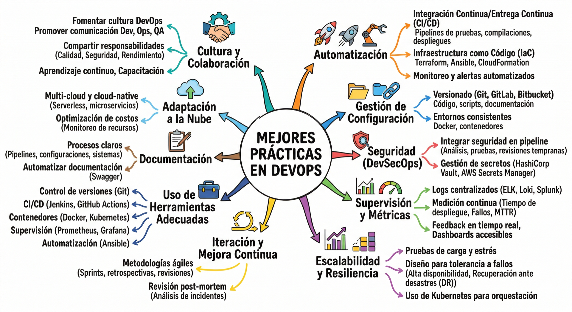 El mapa cubre 10 ejes: cultura y colaboracion, CI/CD e IaC, gestion de configuracion, DevSecOps, metricas, escalabilidad, mejora continua, herramientas, documentacion y adaptacion cloud.